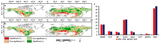 Spatial patterns of drought sensitivity of vegetation during (a) 1982–1999 and (b) 2000–2015. Significance of correlations was assessed at p < 0.05. (c) showed the proportion of high drought sensitivity areas (significantly positive correlation) at each biome.