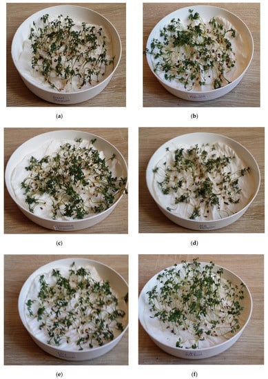 Cress (Lepidium sativum), known also as garden cress, curly cress, mustard, garden pepper cress, pepperwort, pepper grass or poor man’s pepper, is a fast-growing, edible herb [,]. It is suitable for cultivation hydroponically. Edible shoots are harvested within one to two weeks after planting []. The raw plant possesses a high nutrient value as it is rich in A, C and K vitamins, as well as in several dietary minerals. For its specific flavor, cress is added to soups, sandwiches, salads, mayonnaise and salt. It is also eaten as sprouts, and the fresh or dried seed pods can be used as a peppery seasoning [,]. Hydroponic plantations of cress and other plants is interesting from the point of view of so-called smart cities [,]. For its sensitive physiological system, cress serves as a test plants for recognizing the effects of various chemicals on plants and the environment. Recently [], cress seeds were used for the evaluation of toxicity from various microplastics. In the presented study, the physiological activity of water exposed to LPGP, either in the air, under oxygen-free nitrogen, methane or carbon dioxide, was evaluated, involving cress seeds.
