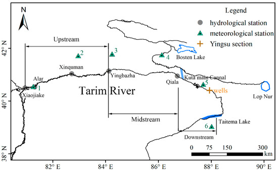 Located in the southern Xinjiang, China, the TR is the largest inland river basin with a typical continental arid climate (Figure 1). The mainstream of TR begins at the junction of Akesu River, Yarkant River, and Hotan River, the upstream segment with a length of 495 km from Xiaojiake to Yingbazha, the middle segment from Yingbazha to Qiala (398 km), and the lower reaches from Qiala to Taitema Lake (428 km). The vulnerability of the TR is embodied in the poor annual precipitation less than 70 mm, and annual evaporation greater than 1000 mm. Due to the overdraft of water resources, the streamflow at the TR downstream has decreased considerably. Consequently, several channel sections dried up especially in the reaches below the Daxihaizi Reservoir, resulting in desertification, rapidly shrunk oases, and degraded ecosystems [24]. To alleviate the deterioration of ecological environment, a string of ecosystem rehabilitation programs have been implemented by the local government, among which the water diversion project for recovery of the TR and the Taitema Lake since 2000 is the most well-known [25].