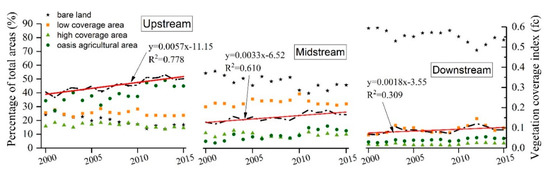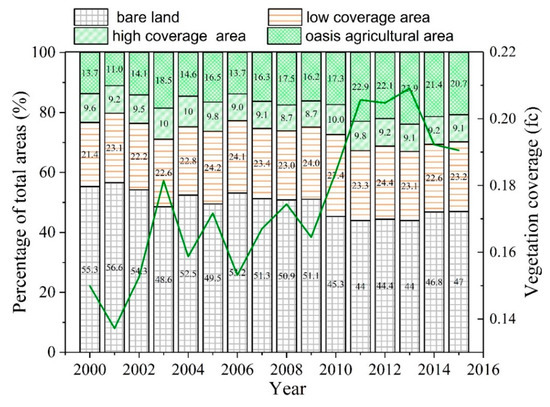 Percentage of the vegetation coverage types over the time period from 2000 to 2015 in the mainstream of the TR. Note that vegetation coverage was classified into four ranks based on the vegetation coverage index [37]: fc < 0.1 for bare land, 0.1 ≤ fc < 0.25 for low coverage area, 0.25 ≤ fc < 0.35 for high coverage area, and fc ≥ 0.35 for oasis agricultural area.