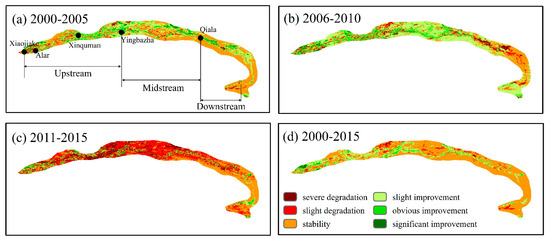 Figure 5 displays spatial distributions of the slopes, calculated with Equation (2) at each pixel, for three different phases: 2000–2005, 2006–2010, and 2011–2015. The change degree of vegetation coverage was classified into six ranks based on Natural Breaks with the ArcGIS software. During 2000 to 2005, the lands with slight and severe degradation accounted for 7.3% of the total area and were mainly distributed in the upstream and the midstream, vegetation coverage accounted for 30%, 13%, and 3.8% of the total area in the TR with slight, obvious, and significant improvement, respectively. The vegetation improvement region was seen in the upstream and midstream from 2006 to 2010, while the region with vegetation degradation was distributed sporadically on the right bank of the downstream. In 2011–2015, the vegetation improvement region accounted for 15% of the total area whereas the severe and slight degradation were 16% and 36%, respectively. Obviously, the vegetation coverage was shown as stable in most of the area of the TR mainstream. The improvements in the vegetation coverage were primarily concentrated in the upstream, whereas the vegetation degradation areas were mainly distributed in the left bank of the midstream and the downstream. Table 1 summarized the change in vegetation coverage in the TR over the period from 2000–2015. Generally, the vegetation improvement area is greater than the vegetation degradation area in the TR mainstream from 2000 to 2015, and the vegetation restoration was shown on both banks of the river, largely related to the change in runoff. Specifically, more than 80% of the vegetation in the upstream and downstream were mostly scattered between the distance of 13 to 14 km to the river channel. The distributive range of vegetation was the largest in the middle reaches with more than 80% of the vegetation distributed in 17–20 km (Figure S1).