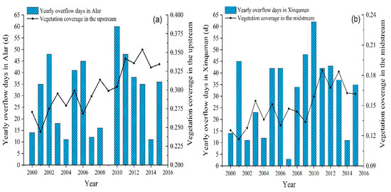 Plots of the vegetable coverage index and the overflow days over the time period from 2000 to 2015 (a) in the upstream and at the Alar station and (b) in the midstream and at the Xinquman station.