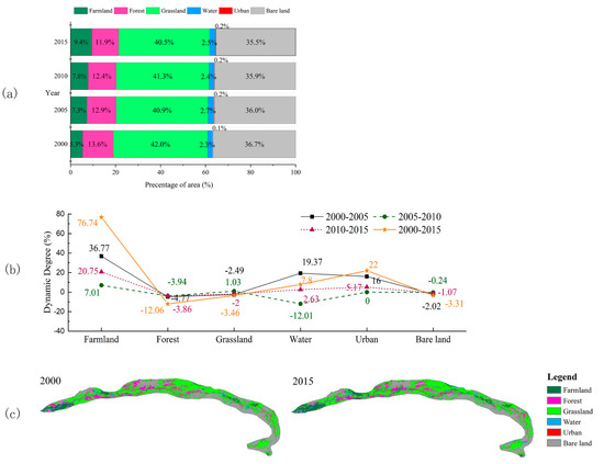 Percentage changes (a), dynamic degree index, (b) and spatial distribution (c) for land use maps in the mainstream of the TR from 2000 to 2015. The map was generated with data available from the Chinese Geospatial Data Cloud [27] using ESRI’s ArcGIS.