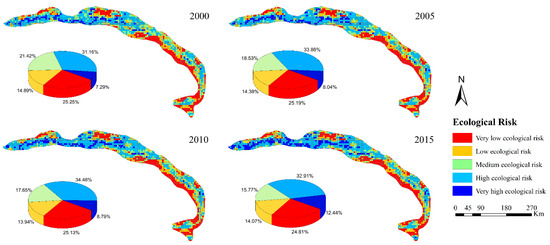 Spatial distribution and proportion of ecological risk in the TR from 2000 to 2015.