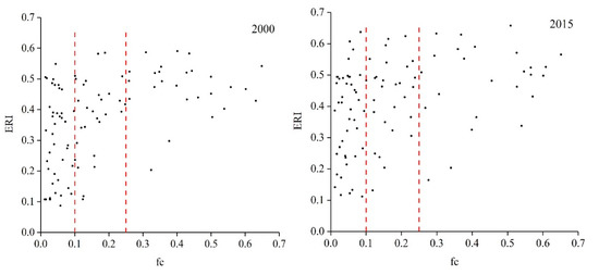 By comparing and analyzing the relationship between vegetation coverage index (fc) and ERI (Figure 10), the fc value was resampled on a 15 × 15 km grid to establish the relationship between fc and ERI at the pixel scale. It could be found that there was little correlation between fc and ERI, and the scatter points representing ERI in Figure 10 correspond to different fc values. In the bare land areas with fc < 0.1, the results showed that ERI has a wide distribution range from 0 to 0.6, which was closely related to the characteristics of bare land. The landscape vulnerability of bare land was relatively high, if it converts to other land use types frequently, the ERI value will be high; if the bare land does not transform in a long period of time, corresponding to the desert area in the downstream of the TR, the ERI value remains low. In both the high vegetation coverage areas and the oasis agricultural areas with fc ≥ 0.25, the ERI values were mostly maintained at a high level corresponding to the high-cover grassland, forest, and farmland, which was related to the increase of farmland areas in recent years, meanwhile, the distribution of farmland, grassland, and forest presents a trend of decentralization under the influence of human activities.