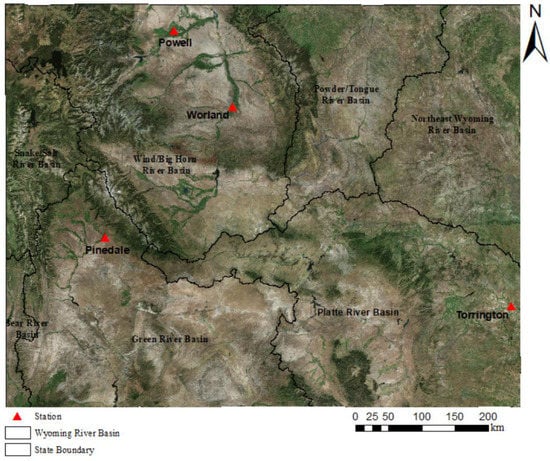 - Sharma, V.; Nicholson, C.; Bergantino, T.; Cowley, J.; Hess, B.; Tanaka, J. Wyoming Agricultural Climate Network (WACNet). In University of Wyoming Agricultural Experiment Station Field Day Bulletin; University of Wyoming: Laramie, WY, USA, 2018; pp. 52–53. [Google Scholar]