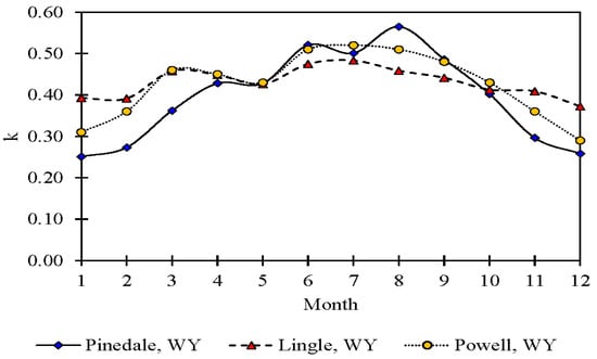 The coefficient k is a calibration coefficient that accounts for site-specific tendency for RH below 100%. Values for k were computed on a monthly basis using measured RH data for each automated weather station (Figure 2). Due to a lack of RH data at the Worland station, k values from the Powell station were used to calculate Tdew. Missing RH data were calculated as the ratio of actual vapor pressure ( to saturation vapor pressure () at the same air temperature as follows:
