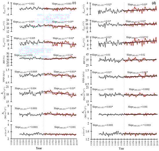 Temporal variation in minimum, maximum, and average temperature (Tmax, Tmin, and Tavg; °C), relatively humidity (RH; %), vapor pressure deficit (VPD; kPa), incoming solar radiation (Rs; MJ m−2 d−1), net radiation (Rn; MJ m−2 d−1), and wind speed (u; m s−1) at 2 m height on an annual time–step for the period-of-record and the common period of 1963–2017 (red line) at (a) Pinedale, (b) Powell, (c) Torrington, and (d) Worland, Wyoming, with slope (yr−1). The asterisks (*) sign represents the significant trends at a 5% significance level. The dotted and solid black lines indicate the linear trend line for total data and the common period (1963–2017).