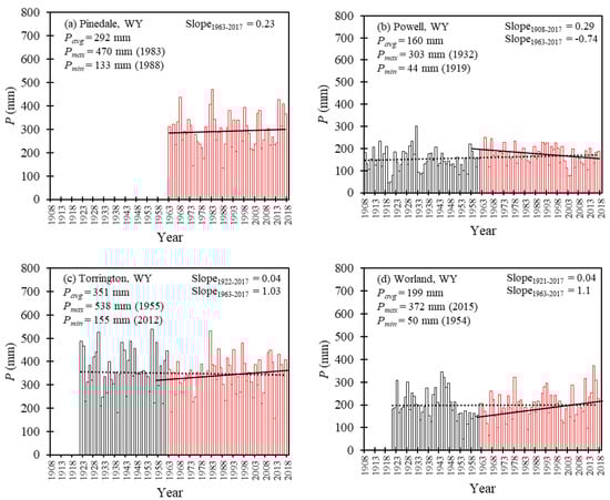 Variation in annual total precipitation (P, mm) at (a) Pinedale, (b) Powell, (c) Torrington, and (d) Worland, Wyoming. The dotted and solid black lines indicate the linear trend line for total data and the common period (1963–2017).