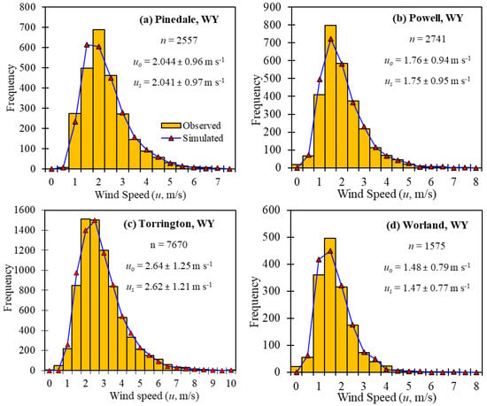Histogram of daily wind speed (u, m s−1) from observed and simulated data for (a) Pinedale, (b) Powell, (c) Torrington, and (d) Worland, Wyoming. The u0 and us represent the mean and standard deviation for observed and simulated data.