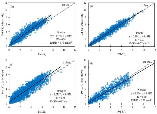 Comparison of reference evapotranspiration (ETo, mm d−1) estimated using modeled variables Penman−Monteith (PM)–ETo (this study) against the Standardized Penman−Monteith estimated reference evapotranspiration (FAO-56) estimated using full measured climate dataset at (a) Pinedale (2011 to 2017), (b) Powell (2010 to 2017), (c) Torrington (2008 to 2017) and (d) Worland (2014−2017).