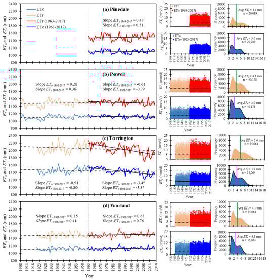 Temporal variation of grass and alfalfa reference evapotranspiration (ETo and ETr, mm) at annual and daily time scale over the period−of−record and from 1963−2017 along with histogram distribution of daily ETo and ETr at (a) Pinedale, (b) Powell, (c) Torrington, and (d) Worland, WY. (Pink and green lines in the histograms represent the mean daily ETr and ETo, respectively.)