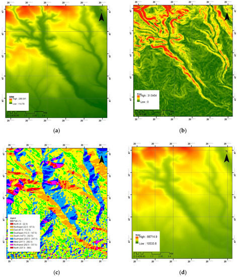 The DEM of the entire study area was extracted from the 1:10 000, EU-DEM using the clipping tool in ArcGIS [37]. The most important parameter of this study was the DEM because three environmental covariates were derived from it. The first environmental covariate derived from the DEM was the slope. The slope had an impact on the runoff of surface water, infiltration rates, and even the rate of erosion, all of which are key to the soil moisture analysis. In ArcGIS, the slope was calculated using the Spatial Analyst Tools/Surface/Slope using the DEM as the input raster. The tool identifies the slope (gradient, or rate of maximum change in z-value) from each cell of a raster surface.