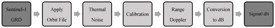 Sentinel 1 ground range detection (GRD) pre-processing workflow, adapted from [39].