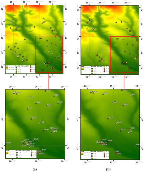 Two images are presented in Figure 6 to visually study the sensor values having the DEM as a background to both images. The image from February 2019 represents a dry period, while June 2019 shows the wet conditions. The dry values occur mainly in the northern part of the images, because of the water seepage downward following the southern sloping nature of the pilot area. In the dry period, the valleys are drier, because their texture is coarser, loamy, and sandy, which retains much less moisture than the clayey material of the plateaus. In contrary, the wet period shows a different picture. The valley bottom becomes wetter due to the accumulating water from the surface runoff. At the same time, the plateaus stay a little bit drier due to the slow and limited infiltration into the clayey material. However, there is some indifferent unexplained variability of the measured values that do not match the overall terrain and soil trends. These are due to short-range micro terrain variability not shown by the DEM or to the differences in the soil properties that we could not map at this scale. This unexplained variability ranges between the 3% and 10% absolute value, with an average of around 5%, which remains unexplained by our models as well, the RMSE for the models, which were found to be in the same range.
