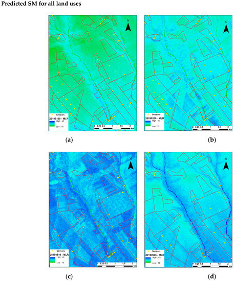 All land use: Predicted soil moisture maps (V%)—(a) January 2019, (b) February 2019, (c) May 2019, and (d) June 2019, respectively.