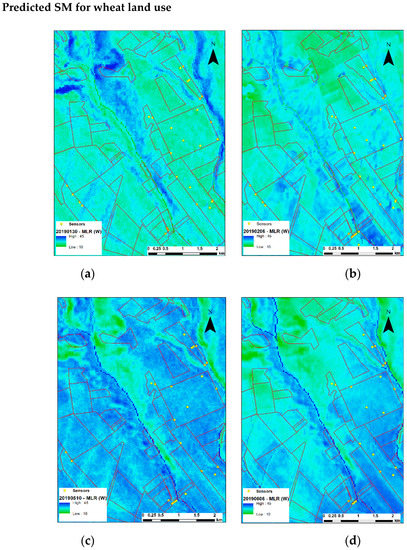 The measured soil moisture statistics describe the soil moisture trend of the study period (Table 5). The January and February dates have low, but not extremely low, values with greater variance. The small rain incident did not saturate the entire area, and the impact of different soil types and terrain created a variable SM due to the soil-terrain factor differences. The standard deviation was the highest in January, followed by high values in February and June, which made it easier for the estimation framework because a lot of the variability could be explained by our variables when the biomass cover was still low. May was the wettest time with the highest mean and the lowest range, meaning a more or less wet soil condition in the whole area. The soils started to dry out in June, due to the hot summer weather, high evaporation, and transpiration of the large biomass and the decreasing precipitation. The model results of MLR (Table 6) showed an R2 value range of 0.19 to 0.25 in the category of “all land uses” whereas in the category of “wheat”, it ranged from 0.28 to 0.35. The RMSE ranged from 5.86 to 4.14 in the category of “all land uses” whereas in the category of “wheat”, it ranged from 4.76 to 3.77. This highlights that the model is better at predicting soil moisture in one land use as opposed to many land uses. Additionally, the RMSE agrees with the literature on satellite backscatter coefficients, indicating the different types of land use significantly affect the independent variable (backscatter coefficient) of the model. As a result, RMSE values of >3 are usually achieved [23].