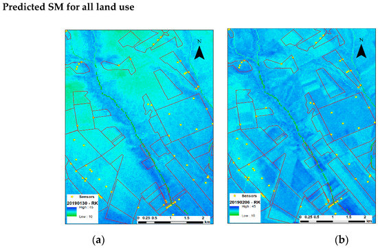 (2) Regression kriging (RK) is one of the most popular spatial interpolation techniques in soil science [26]. The regression kriging results showed that the proposed empirical model predicted the soil moisture content with the RMSE range of 1.30 to 4.39, depending on the standard deviation of the measured values, which was considered acceptable considering the sample size deployed, and area mapped. In order to explain the unexplained stochastic component of the variation, the error values on the observation sites were calculated and krigged over the study area, assuming a spatial dependence structure in the values driven by some unexplained factors of the landscape. These values were used to correct the regression estimation, and the process was validated with the leave-one-out cross-validation approach. The calculated RMSE values were significantly lower for all cases and often resulted in a considerable accuracy improvement. However, it has to be noted here that this improvement in the statistics is very dependent on the spatial setup and representativity of the sampling design, and does not always correct the error evenly over the landscape and land uses.