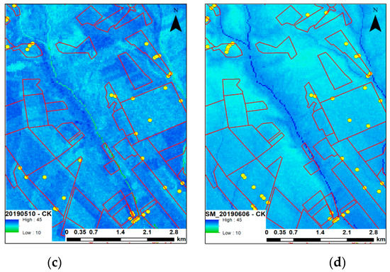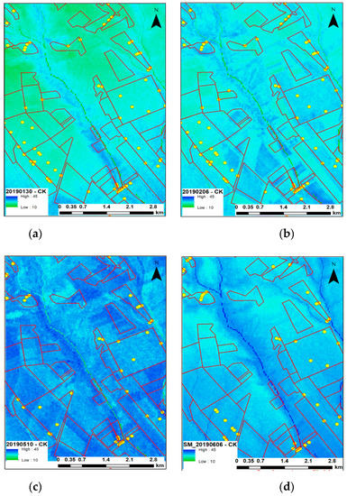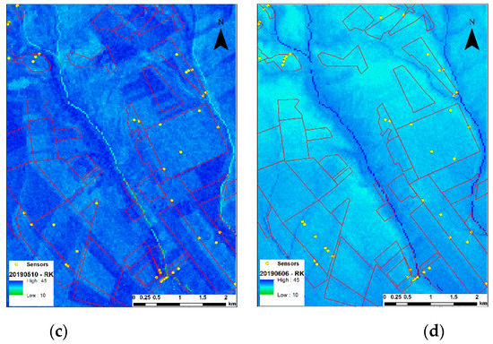 The interpretation of the spatial structure of the predicted SM images describes the weather trends and the redistribution of the SM due to the soil-landscape processes well. Figure 7 and Figure 8 show four SM images of the study area using the same color scheme. We had a dry January, a little bit wetter though dry February. May and June were wetter with high precipitation, with increasing evapotranspiration due to the high biomass and the warming summer weather. This means the water balance changed by June from positive to negative, and the area started to dry up. This process is evident, with the reintroduction of the greenish colors on the northern part of the image resulting in a textbook-like example of SM redistribution due to water seepage flowing to the southern sloping terrain of the foothill area/s and the drying of the plateaus, while the lower parts of the slopes are still wet (Figure 7c,d and Figure 8c,d).