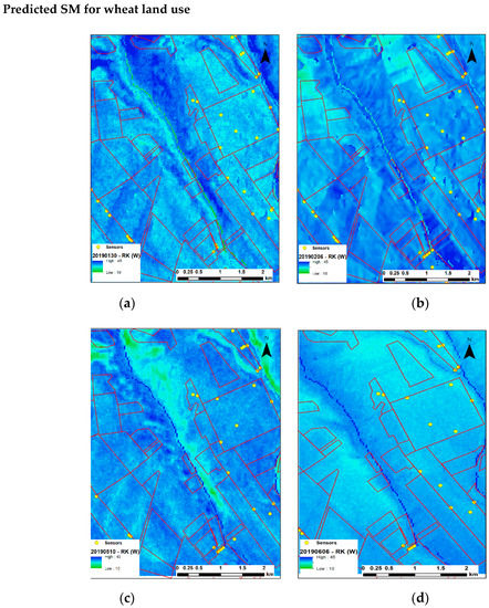 The selection of the optimal day of each month was based on the Sentinel 1 image availability that had the “least border noise effect” during the month. The accuracy assessment of the regression model was conducted in ArcGIS, and the statistical metrics, namely R2 and RMSE, were determined, as shown in Table 4. The regression kriging and cokriging results were generated with the geostatistical toolset of ArcGIS. The results are presented monthly for four months, and they are differentiated into two groups: “all land uses” and “wheat land use”.