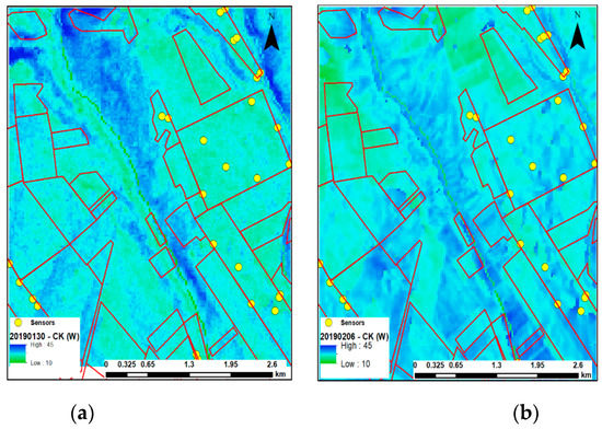 All land uses: Ordinary cokriging soil moisture— (a) January 2019, (b) February 2019, (c) May 2019, and (d) June 2019, respectively.