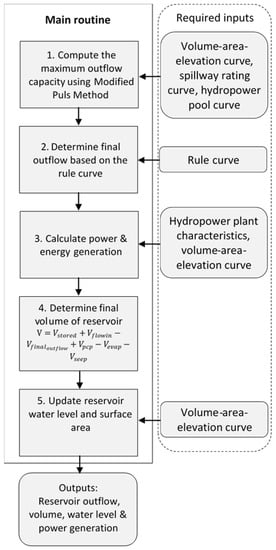 The SWAT reservoir routine allows the user to determine Voutflow with one of four different methods: measured daily outflow, measured monthly outflow, average annual release rate for uncontrolled reservoir and controlled outflow with target release (Figure S1) [34]. In the measured daily or monthly outflow method, the reservoir outflow (Voutflow) is determined using time series data of daily or monthly outflow rate provided by the user. Contrarily, in the average annual release rate method, the reservoir releases water whenever the reservoir volume exceeds the principal spillway volume of the reservoir. In the target release method, the reservoir releases water as a function of the target storage and defined non-flood season [37]. In this way, the existing SWAT reservoir routine was primarily developed for those reservoirs which have adequate measured outflow data. In addition, SWAT allows one to simulate flood control reservoirs just accounting two flood limit levels and monthly flood storage, and it is especially suitable only for small reservoirs. Thus, the applicability of SWAT for highly-regulated, large-scale reservoirs with hydropower generation capacity is limited. In order to address this limitation, we developed a new algorithm for the SWAT reservoir routine to simulate hydropower reservoirs under predefined complex operational rules.