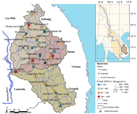 The Mekong is the largest trans-boundary river basin in Southeast Asia, with a catchment area of 795,000 km2, discharging 475 km3 of water annually [45]. Originating from the Tibetan Plateau, the river flows through China, Myanmar, Laos, Thailand, Cambodia and Vietnam (Figure 2). The 3S rivers (Sekong, Sesan and Srepok), are the largest tributary system, thereby contributing about 20% of flow to the lower Mekong basin. The catchment area of the 3S basin is 78,650 km2, of which 33% is situated in Cambodia, 29% in Lao PDR, and 38% in Vietnam. Energy demand has begun to sharply increase in the Southeast Asian region since 2000 due to growing populations, rising incomes, rapid urbanization and easy access to energy [46]. Therefore, currently hydropower reservoirs in the 3S basin are being planned and developed at a fast pace to fulfill the increasing energy demand [45]. In this study, we considered 38 hydropower projects (Figure 2) to investigate climate change impacts on energy production and to quantify hydrological alterations due to operation of these reservoirs. We selected hydropower projects according to their status of progress (existing, under construction, proposed), size, location, installed capacity, development priority and data availability (Table S2).