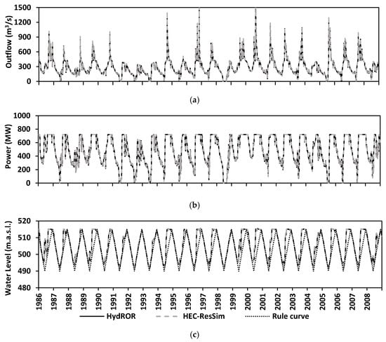 A comparison of simulated outflows from the Yali hydropower reservoir between HydROR and HEC-ResSim models shows an excellent fit for outflows, power production and water levels with NSE and R2 values exceeding 0.99, and RSR and PBIAS values lower than 0.01 (Figure 3 and Figure 4), confirming that the new routine reproduces the HEC-ResSim results. The disagreement in some instances stems from the different interpolation methods used by the two models. HydROR and HEC-ResSim reproduce the operation of the reservoir equally well, as shown in Figure 3c when simulated water levels are compared to a given input rule curve. In this study, we have set the HEC-ResSim as a benchmark model to evaluate the capability of the HydROR, because previous studies [11,40,48,61,62] have shown that the HEC-ResSim can simulate hydropower reservoirs according to imposed operating rule curves, predefined constraints and goals. The HydROR, like HEC-ResSim, requires the user to enter physical properties of hydropower plants, outlet capacities, reservoir geometry and operation policies (rule curves) to realistically simulate power generation and water releases.
