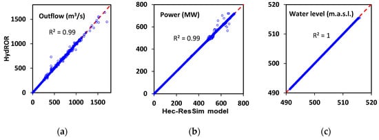 Scatter plots of (a) outflow, (b) power generation and (c) water level for HydROR (vertical axes) and HEC-ResSim (horizontal axes).