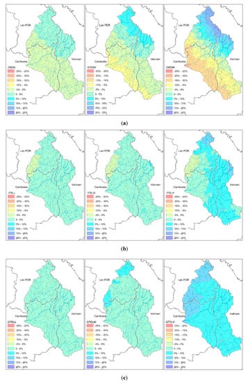 Annual average precipitation changes for the three GCMs and three emissions scenarios (L, M, H) with respect to the baseline period for the 3S basin showed significant spatial variation (Figure 5). According to the GISS model scenarios, annual precipitation will decrease up to 15% in the northeastern part of the 3S basin (most of that area lies in Lao and Vietnam) and will increase up to 20% in the southwestern part of the 3S basin (most of those areas lie in Cambodia). Average annual precipitation will increase up to 10% for the IPSL model scenarios, with strong spatial variations, depending on the emissions scenario. Similarly, the GFDL model scenarios also point to an increase in precipitation by 0.5–12%, yet the spatial distribution of the change in precipitation across the basin is the opposite to the distribution in the IPSL model’s results. Overall average annual changes in precipitation are −0.8%, 2.8% and 4.5% under the GISS, IPSL and GFDL models for the 3S basin respectively, indicating rather low impact of climate change on the annual precipitation amount at the basin level.