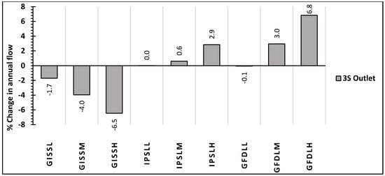 Percentage (%) change in average annual flow under three emissions scenarios (L—low, M—medium and H—high emissions) for the GISS, GFDL and IPSL models with respect to the baseline climate (BL) scenario at the 3S outlet.