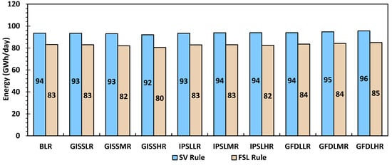 Average daily energy generation using the seasonal variation rule curve (SV rule) and full supply rule (FSL rule) curve for the baseline climate (BLR) scenario and for each emissions scenario (L—low, M—medium and H—high emissions) of the GISS, GFDL and IPSL models due to operation of reservoirs (R—reservoir operations).