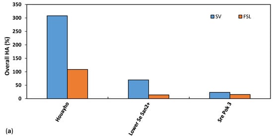 An alteration in the hydrologic regime can be observed downstream of all reservoirs. However, the magnitude and nature of the impact vary considerably by the reservoir, operation rule and climate change scenario. The mean overall HA from baseline conditions is 102% under the SV rule, with the highest value of 308% and the lowest value of 16% for specific reservoirs (Figure 8a). The reservoirs in the Xe Kong River, a tributary of the Se Kong River, have high HA values (highest value for the Houayho hydropower scheme), whereas reservoirs in the Sesan sub-basin (except for Upper Kontum) and the Srepok sub-basin have comparably low HA values under the SV rule (Figure S6 and Table S8). The lowest impact results from the Xe Kaman 4A reservoir in the Sekong sub-basin.