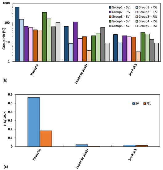 The ratio of HA to simulated hydropower generation in GWh per year (Figure 8c) represents the impact of reservoirs in terms of energy production. The Xe Nam Noy 5, Namkong 3 and Xekaman-Sanxay hydropower schemes show the highest HA to energy production ratios, whereas Yali hydropower scheme shows the lowest ratio (Figure S6c).