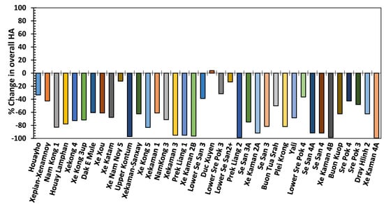 Percentage changes in overall HA due to operation of hydropower reservoirs under seasonal variation rule curves with respect to operation of reservoirs under full supply level rule curves for the baseline climate (BLR) scenario.