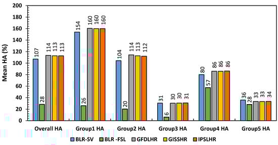 Comparison between mean HA of the baseline climate using the seasonal variation rule curve (BLR-SV scenario) and the full supply rule curve (BLR-FSL scenario), for GFDL, GISS and IPSL models under high emissions scenarios using the seasonal variation rule (denoted as GFDLHR, GISSHR and IPSLHR) for overall HA and the five HA groups considered.