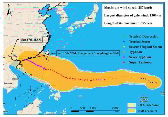 Super Typhoon Mangkhut generated from the Western North Pacific on 7 September 2018. It swept across the Philippines and landed in China on 16 September 2018. It was the second most intense storm that impacted Hong Kong since 1946 []. There were more than 100 deaths in the Philippines until 18th September 2018 [], and at least 458 people were injured. More than 60,000 fallen trees were reported and over 40,000 households in Hong Kong were interrupted []. Typhoon Mangkhut was characterized by its maximum wind speed of 287 km per hour and its large diameter of the gale, reaching 1300 km wide and moving 6550 km (Figure 1). Compared with other tropical cyclones in 2018, Typhoon Mangkhut was the most powerful []. Large areas in China and the Philippines were influenced by strong winds and heavy precipitation that resulted from Mangkhut.