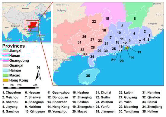 Thirty-five cities in Southern China that were impacted by both gale winds and heavy precipitation during Typhoon Mangkhut were selected as study areas. These included 21 cities in Guangdong, nine cities in Guangxi, one city in Hunan, one city in Jiangxi, one city in Hainan, Hong Kong, and Macao (Figure 2).
