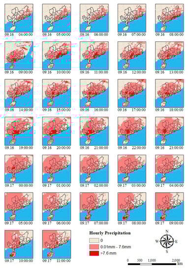 Hourly precipitation data were collected from the Global Satellite Mapping of Precipitation (GSMaP) dataset, which was published on Google Earth Engine. The values of hourly precipitation rate in GSMaP were estimated using multi-band passive microwave and infrared radiometers from the GPM Core Observatory satellite, with the assistance of a constellation of other satellites. The spatial resolution is 0.1 × 0.1 degree [,]. The grid-cell data of hourly precipitation rate in the study area were collected, and those grids which represented heavy rain were selected. Here we employ the definition from a glossary of meteorology from the American Meteorological Society, which defines “heavy rain” as having a precipitation rate of over 7.6 mm per hour. Figure 3 shows the detailed information of hourly precipitation in the study area; the time zone in this research is UTC+8.