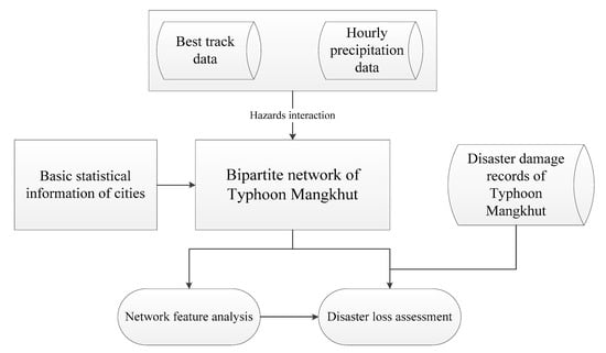 The main steps for disaster network construction based on input datasets and bipartite network framework are presented in Figure 4. The primary purpose of the construction is to discover the dynamic mechanism of Typhoon Mangkhut and evaluate the targeted cities that were influenced by multi-hazards efficiently and scientifically. The main steps are as follows: (1) coupling gale hazard data from the best track dataset with heavy rain hazard data from hourly precipitation dataset; (2) establishing a disaster network based on the multi-hazards data and basic information of cities; (3) analyzing the characteristics and features of the disaster network, such as network density, clustering coefficient, and small-world nature; and (4) evaluating disaster loss of the Typhoon Mangkhut based on the disaster network and observed disaster damage records.