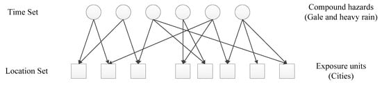 To solve the problems of multi-hazards in tropical cyclones, many scientists and researchers focus on multi-hazards’ assessment based on qualitative and quantitative analysis [,,,]. Among an array of methodologies reviewed in Kappes et al. [], there are many different kinds of multi-hazard assessment methodologies that focus on various challenges, such as multifactor analysis, system dynamics, probabilistic models, joint probability distributions, and complex networks [,,,,]. Compared with other methodologies, a complex network is a useful tool which could build the relationship easily between each component in complex systems in the real world. In recent years, complex networks have been employed in many hazards and disaster studies around the world, such as for extreme rainfall, earthquakes, droughts, flooding, and forest fires [,,,,,]. However, a complex network still needs to be established for tropical cyclone assessment, to discover the dynamic mechanism of disaster evolution and the interactive relationship between different relevant hazards factors such as gale, heavy precipitation, flooding, storm surges, and sea-level rise. In this study, the bipartite network, which is a special type of complex network, was employed, to analyze multi-hazards impacted by Typhoon Mangkhut in China in 2018.