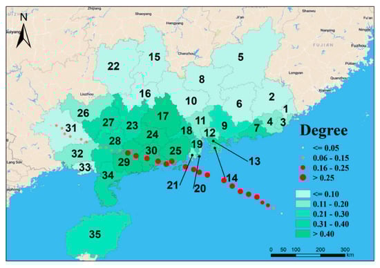 The centrality degree (CD) of a node describes the number of other nodes that connect with a particular node. In order to compare the CD of nodes in different graphs with different scales, the normalized centrality degree (CDn), which is CD divided by the number of nodes in a network except itself (N-1), has been defined as a prominent statistic factor to analyze the importance of a node in the whole network. Figure 7 shows the result of the normalized centrality degree of each node in the disaster network, which was calculated by the two-mode centrality module in UCINET. Yunfu (24), Maoming (29), Yangjiang (30), Jiangmen (25), and Zhaoqing (17) had a higher normalized centrality degree (bigger than 0.4), meaning that multi-hazards impacted these cities for a longer time. In addition, there is a “peak time period”, which includes 15 nodes (hour) from 08h00 to 22h00 on 16th September 2018 that had a higher normalized centrality degree (bigger than 0.25), meaning that, during these hours, many cities suffered from multi-hazards impact.