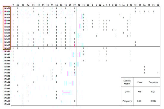 Core–periphery classification matrix of disaster network. Note: There are 13 h in core block that also belong to the “peak time period”.