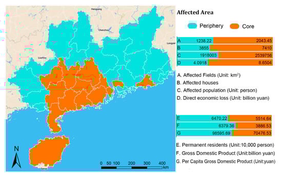 The disaster damages for the core and periphery areas are shown in Table 2. Approximately 4.5 million people were affected by Typhoon Mangkhut, with 2.5 million people being in the core area and 1.9 million people in the periphery area. The affected population in the core area is 32.4% higher than that in the periphery area. Typhoon Mangkhut also destroyed more than 3000 km2 of farmland and 11,000 houses, and the direct economic loss was 12.7 billion Yuan (i.e., 1.9 billion USD). The impact on the core area was greater than on the periphery area (70% vs. 55% of the population affected, respectively), with double the loss of farmland and buildings and direct economic loss. The economic loss in the core area was estimated to be 0.22%, which was almost quadruple that in the periphery area.