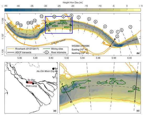 This study focuses on a stretch of approximately 18 of the Tien River branch, which was surveyed during the dry and wet season of 2018 [6] and provided valuable datasets for the set-up and validation of a high-resolution numerical model of the river’s hydro- and morphodynamics. The study area is located between the city of Sa Dec and the bifurcation spot of the Tien River and the Co Chien River near Vinh Long (see Figure 1). Tides within the area exhibit a mixed, mainly semi-diurnal character. Due to the interaction of tides and riverine discharge, currents within the study area are bidirectional, i.e., directed upstream during high tide and downstream during low tide. During the wet season, the monsoon-induced amplification in riverine discharge leads to currents being almost exclusively directed towards the ocean. Within the study area, water levels, discharges and suspended sediment concentrations (SSCs) are continuously measured at the hydrological station of My Thuan. Monthly mean discharges vary between approximately 1800 to 13,400 / [35]. The annual sediment flux of about M t/yr [35] is dominated by cohesive sediments, with sand only contributing approximately M t/yr [36]. Bed load transport only marginally contributes to the total sediment flux (<1%) [6]. Bed aggregates within the study area mainly consist of fine to medium sands [6,37]. Mud content increases towards shallow areas with low flow velocities, while coarser bed aggregates are found at locations where deep scour holes have formed. The morphological activity within the investigated Tien River section is known to be high. Recent findings indicate that hydropower dam operation and sand mining have triggered bank erosion and the incision of the river’s channel in recent years [6].