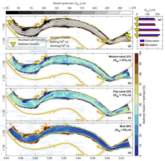 Bed sediment distribution at the end of the bed composition generation (BCG) run, including positions of riverbanks and selected bed sediment samples. Riverbanks were extracted from historical Landsat-7 imagery using the MNDWI [38]. Landsat-7 images courtesy of the USGS, downloaded from the USGS EROS Centre (https://earthexplorer.usgs.gov). (a) Median grain-size within the upper bed layer at the end of the BCG run. (b) Amount of sediment fraction (medium sand) in the upper bed layer at the end of the BCG run. (c) Amount of fraction (fine sand) in the upper bed layer at the end of the BCG run. (d) Amount of fraction (mud) in the upper bed layer at the end of the BCG run. (e) Comparison of median grain-sizes between the numerical model and selected bed sediment samples. Locations of the samples are shown in panel (a).