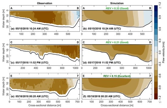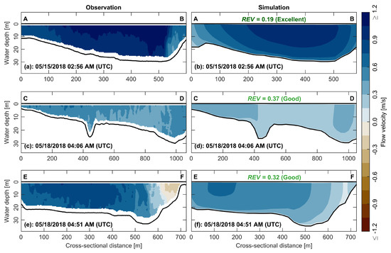 Simulations were initially run in three-dimensional configuration with 20 vertical sigma layers to validate the hydrodynamics within the model. The simulation results for this configuration were compared to measured ADCP profiles. Velocities were measured along transects A–B, C–D and E–F (see Figure 1) at different times during the 2018 dry season. Simulated and measured velocities were evaluated according to the relative error vector (REV) [57] to quantify the performance of the model. The is calculated as follows: