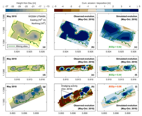 where B is the initial bathymetry at the start of a simulation, Y is the predicted bathymetry at the end of a simulation, X is the corresponding measured bathymetry at the same time and is the measurement error. Due to the accuracy of the performed MBES measurements, a measurement error of was used for the calculation of the . The classification for the is shown in Table 1. In order to quantify the model quality for morphodynamic processes, the evolution of the sand mining sites to (see Figure 1) was simulated from 10 May to 10 October 2018. In contrast to other sand mining sites within the study area, these locations were surveyed in detail during both the 2018 dry and wet season, thus enabling the comparison of their observed morphological evolution to model results. According to values of 0.62 and 0.44 (see Figure 5c,f), the model performance can be considered good for reproducing the refilling process at mining sites and . Based on a of 0.06 (see Figure 5i), the model shows poor performance simulating the morphological evolution of mining site . However, the model performance for this location is likely affected by neglecting dredging activity during the model validation, as information about the operation of dredgers between May to October 2018 was lacking. The measured validation data indicates that continuous dredging activity was disturbing the refilling process at mining site , leading to discrepancies between model results and observations. Accordingly, the overall model performance for morphodynamic processes is also considered good.