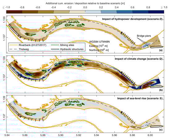 Patterns of additional cumulative erosion (red) and deposition (blue) in relation to the baseline scenario, including positions of riverbanks, the river’s thalweg, implemented sand mining sites and hydraulic structures. Riverbanks were extracted from historical Landsat-7 imagery using the MNDWI [38]. Landsat-7 images courtesy of the USGS, downloaded from the USGS EROS Centre (https://earthexplorer.usgs.gov). Sand mining sites were separated from the surrounding bathymetry using the approach in [6]. (a) Impact of hydropower development (scenario D) on the erosion and deposition pattern. (b) Impact of climate change-related increase in discharge (scenario Q) on the erosion and deposition pattern. (c) Impact of RSLR (scenario S) on the erosion and deposition pattern.