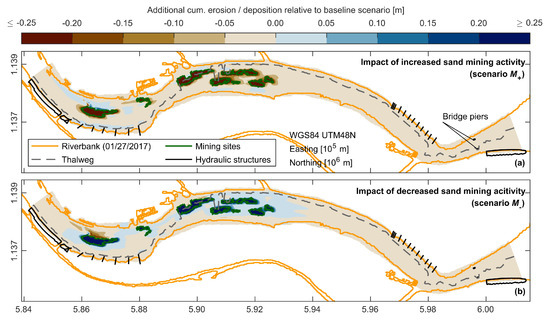 Patterns of additional cumulative erosion (red) and deposition (blue) in relation to the baseline scenario, including positions of riverbanks, the river’s thalweg, implemented sand mining sites and hydraulic structures. Riverbanks were extracted from historical Landsat-7 imagery using the MNDWI [38]. Landsat-7 images courtesy of the USGS, downloaded from the USGS EROS Centre (https://earthexplorer.usgs.gov). Sand mining sites were separated from the surrounding bathymetry using the approach in [6]. (a) Impact of increased sand mining activity (scenario ) on the erosion and deposition pattern. (b) Impact of decreased sand mining activity (scenario ) on the erosion and deposition pattern.